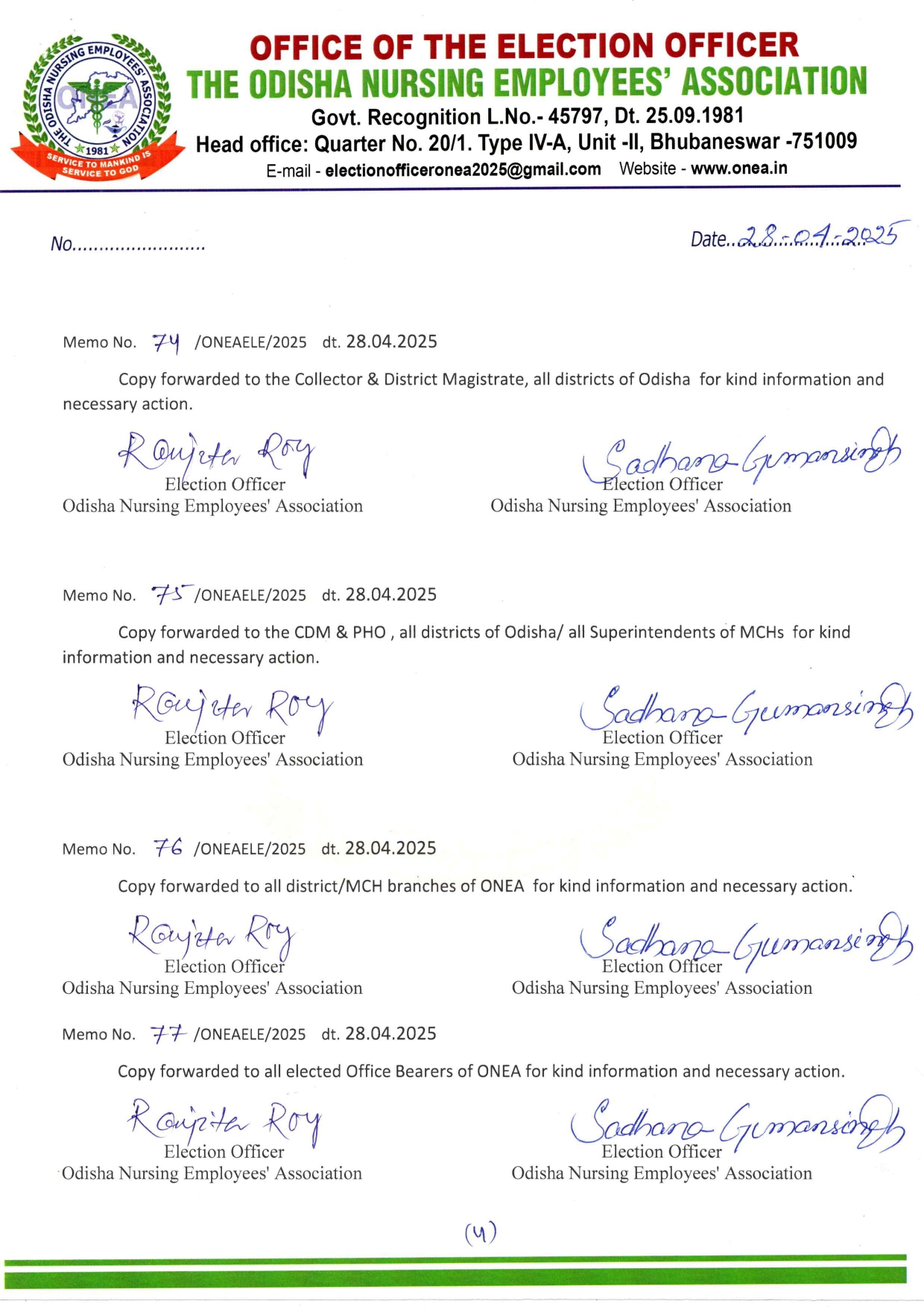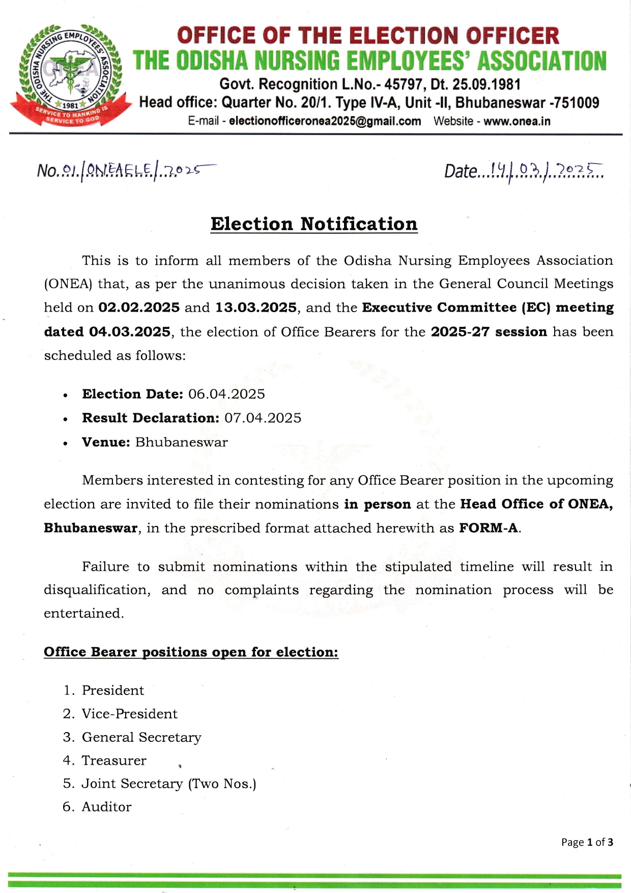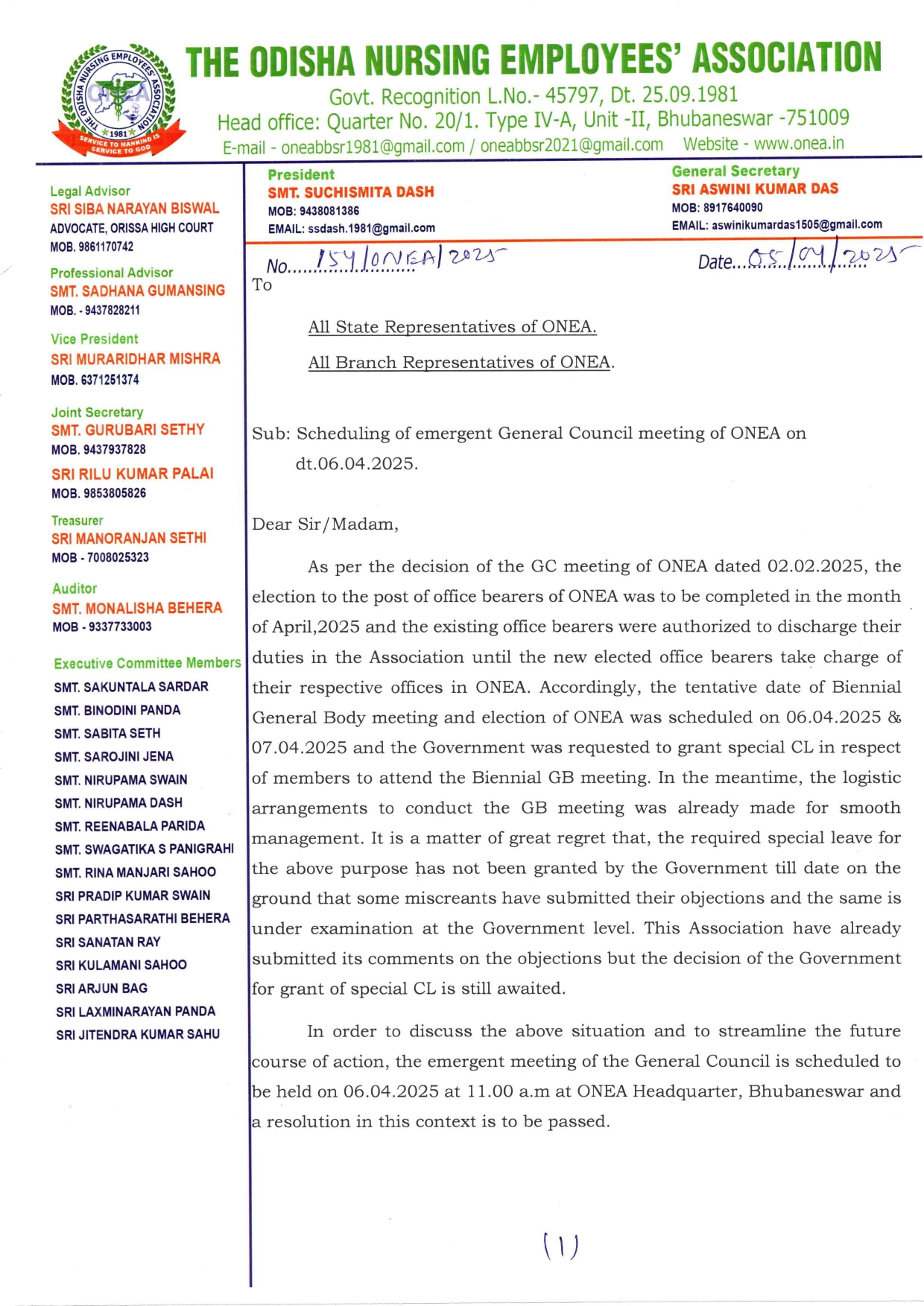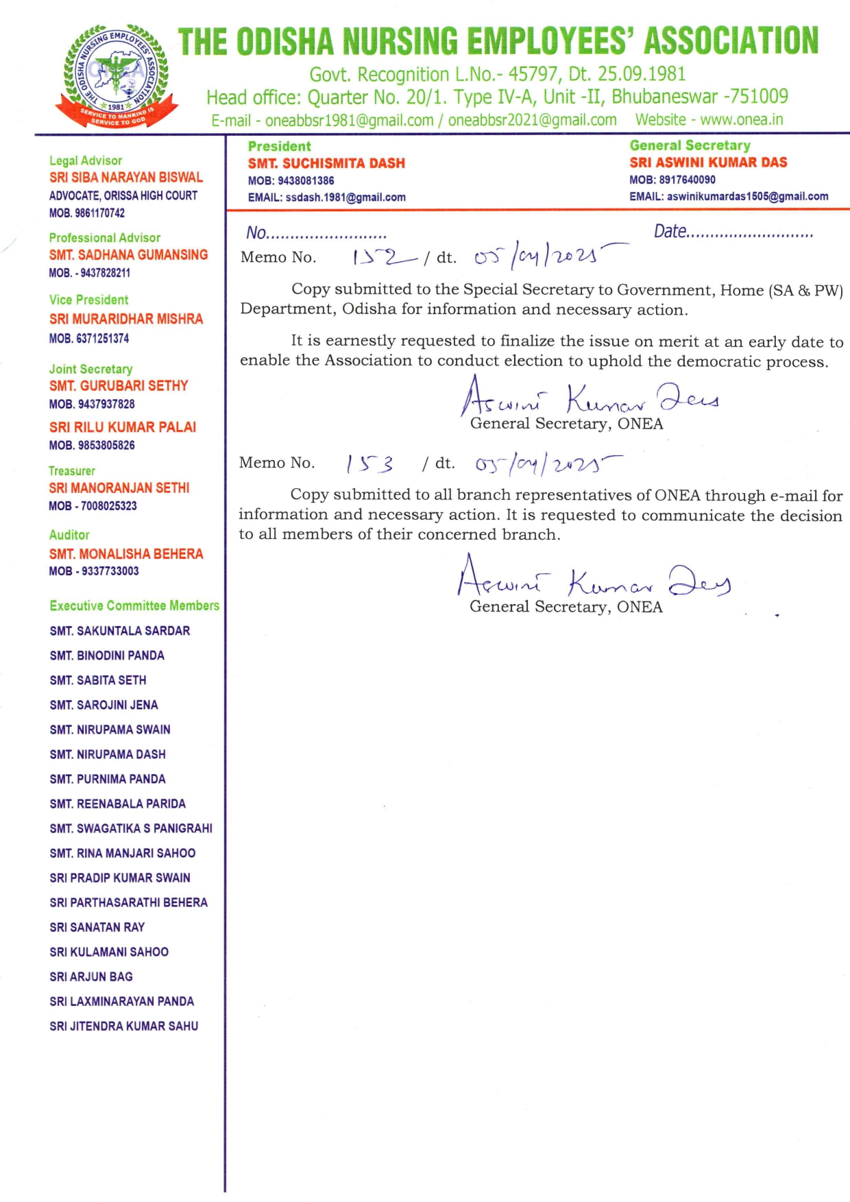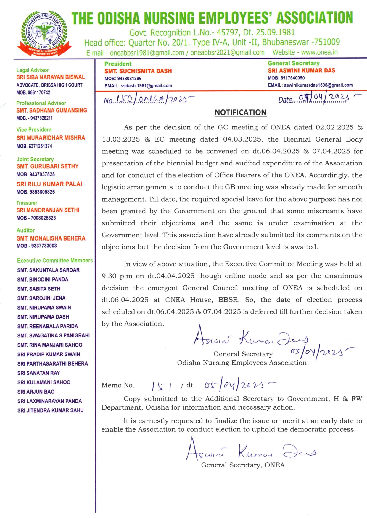 The Odisha Nursing Employees Association (ONEA) is a registered service association of all Nursing Officers, Tutors, Asst. Professors of Nursing Education, Asst. Nursing Superintendents, Deputy Nursing Superintendents, Asso. Prof. of Nursing Education & Nursing Superintendents working in different Govt. Health Care Sectors and nursing educational institutions and it has been recognized by the Government of Odisha vide Home (Assn.) Department Order No.45797, Dated 25th September 1981 <<Read More>>