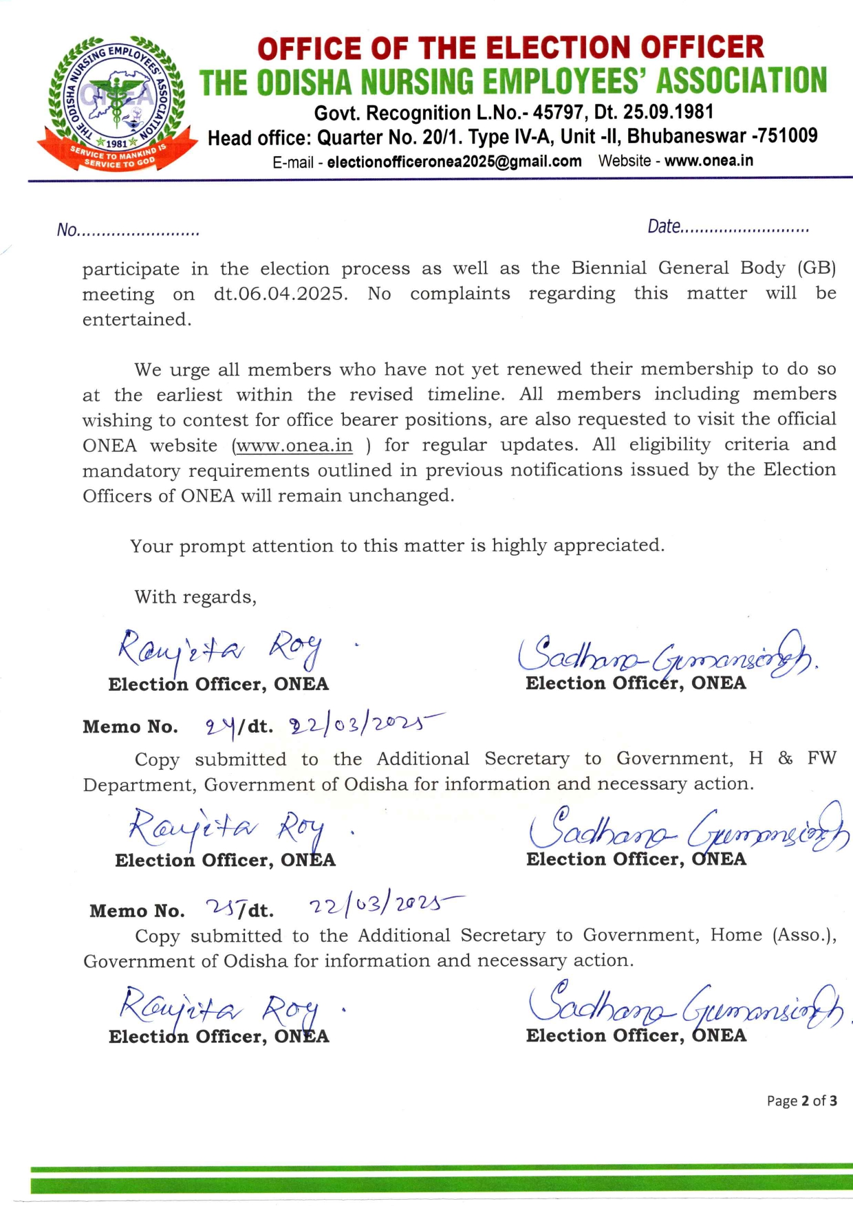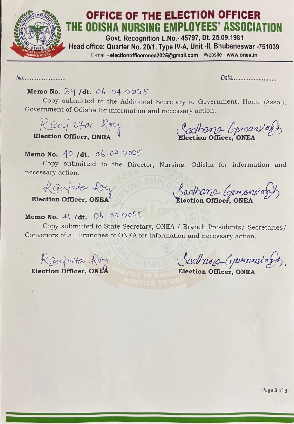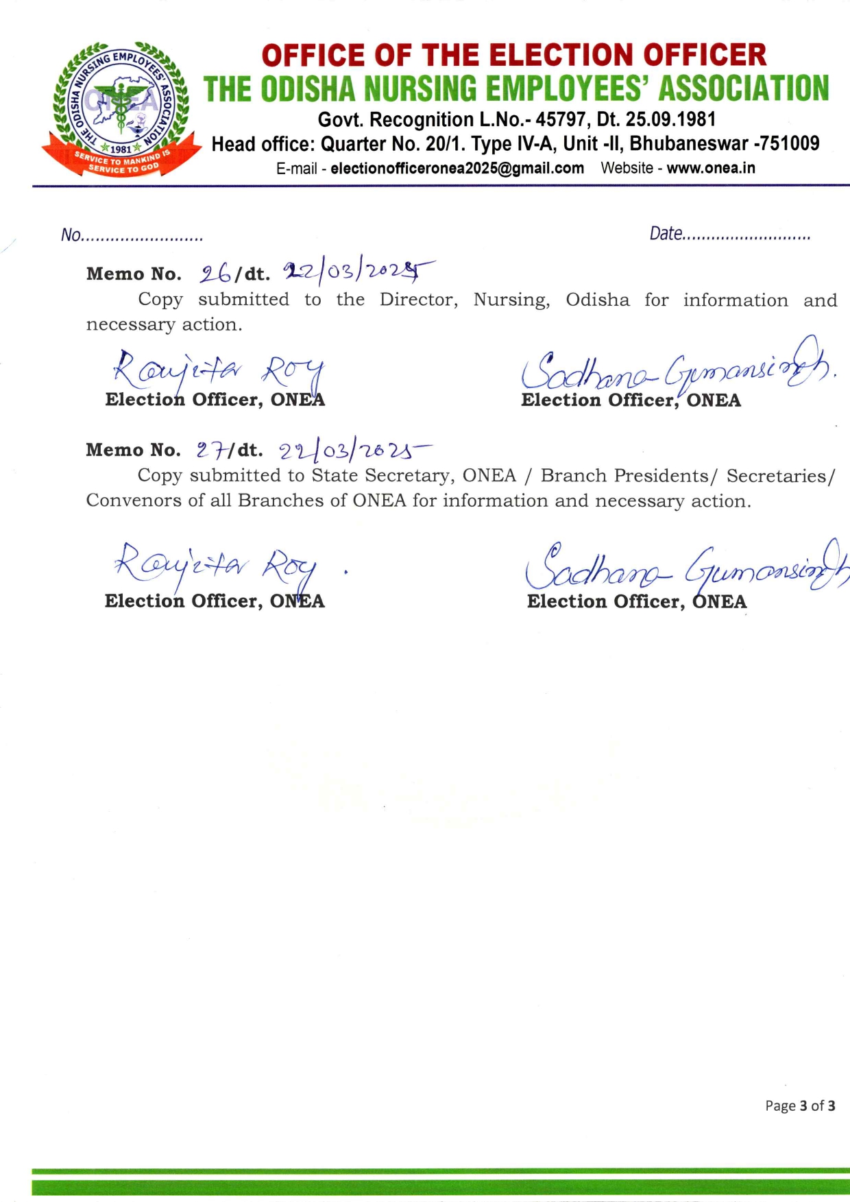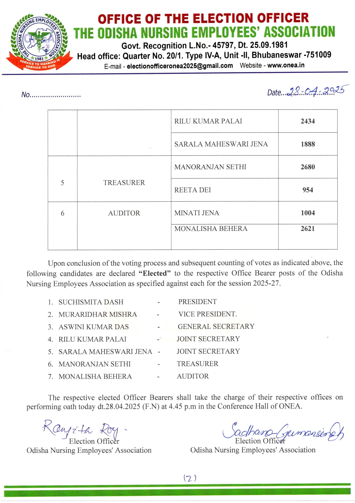 The Odisha Nursing Employees Association (ONEA) is a registered service association of all Nursing Officers, Tutors, Asst. Professors of Nursing Education, Asst. Nursing Superintendents, Deputy Nursing Superintendents, Asso. Prof. of Nursing Education & Nursing Superintendents working in different Govt. Health Care Sectors and nursing educational institutions and it has been recognized by the Government of Odisha vide Home (Assn.) Department Order No.45797, Dated 25th September 1981 <<Read More>>