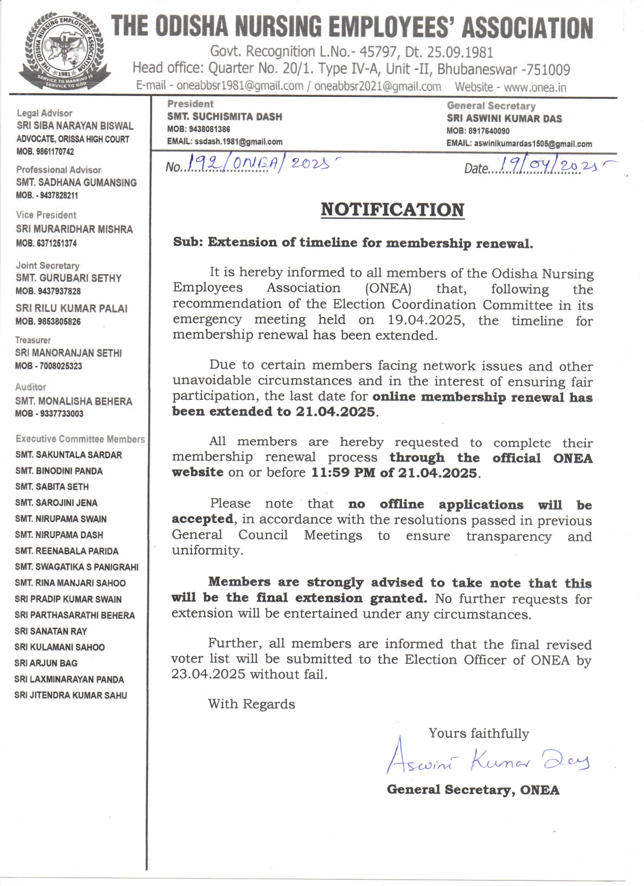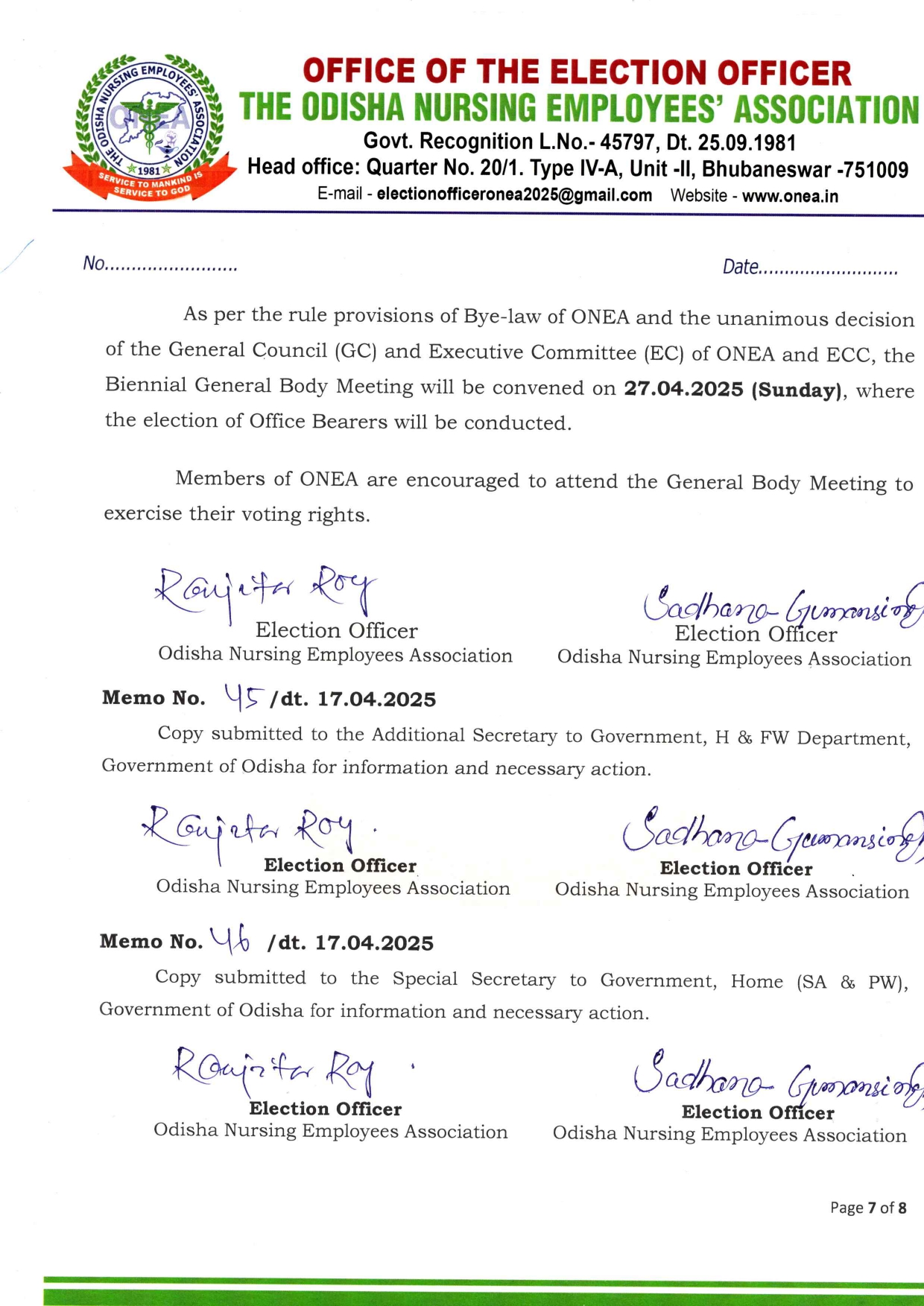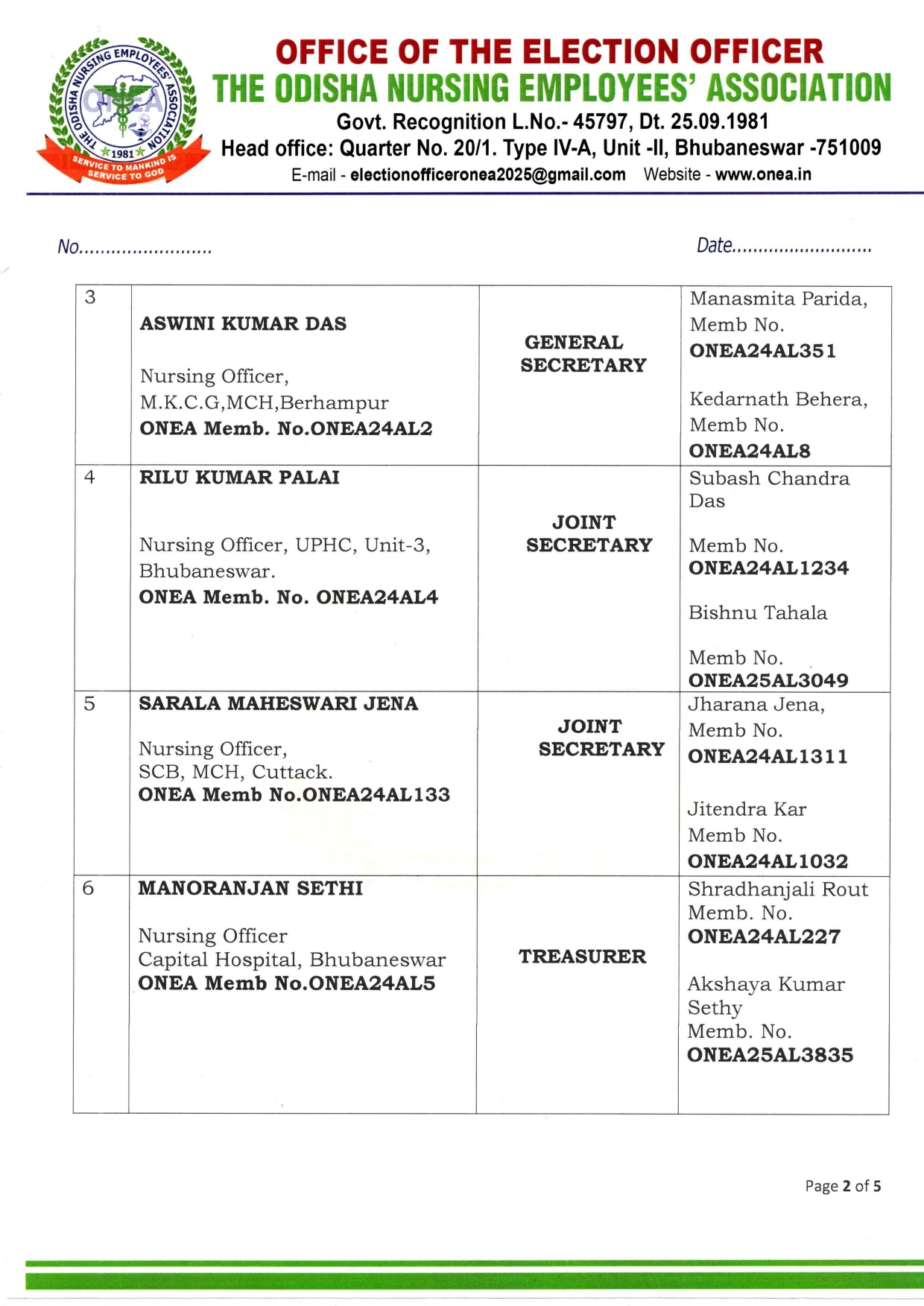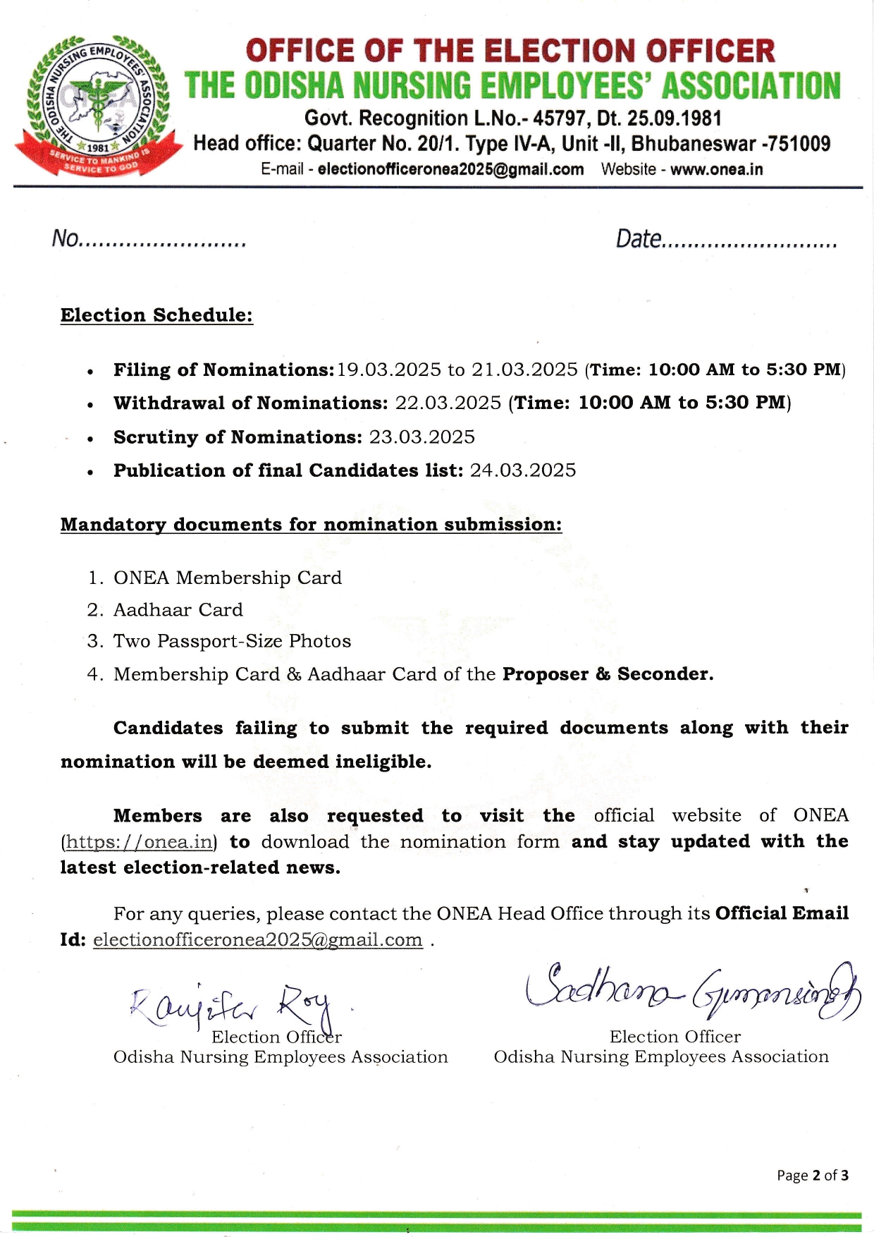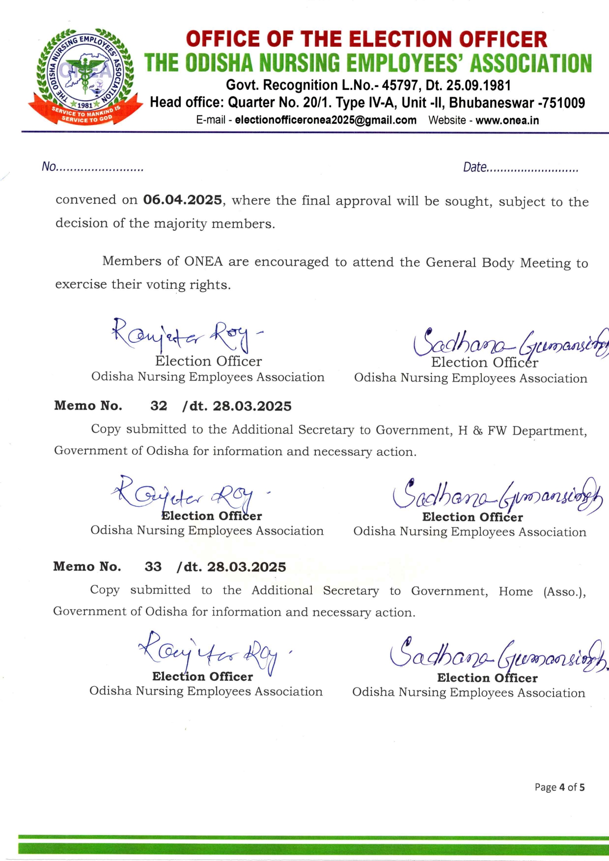The Odisha Nursing Employees Association (ONEA) is a registered service association of all Nursing Officers, Tutors, Asst. Professors of Nursing Education, Asst. Nursing Superintendents, Deputy Nursing Superintendents, Asso. Prof. of Nursing Education & Nursing Superintendents working in different Govt. Health Care Sectors and nursing educational institutions and it has been recognized by the Government of Odisha vide Home (Assn.) Department Order No.45797, Dated 25th September 1981 <<Read More>>
