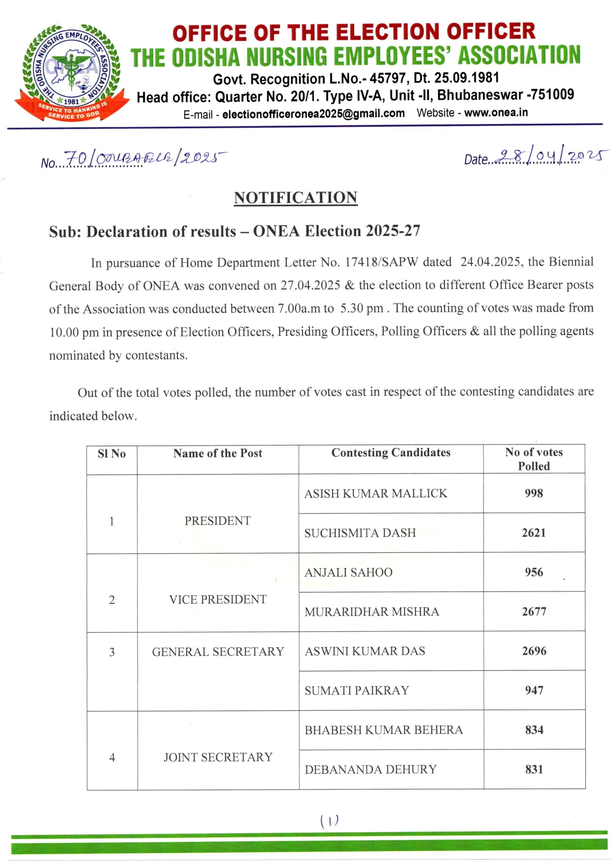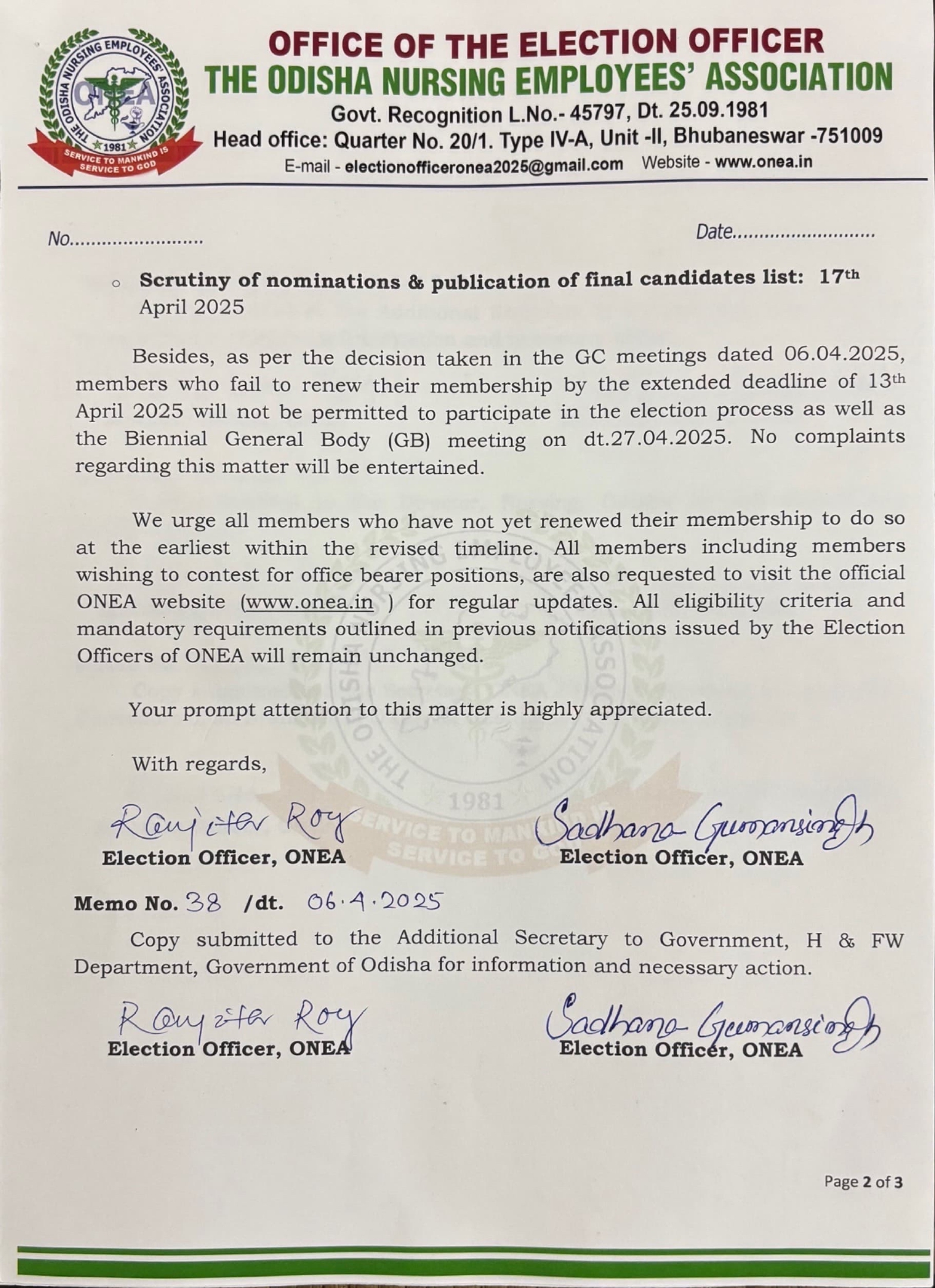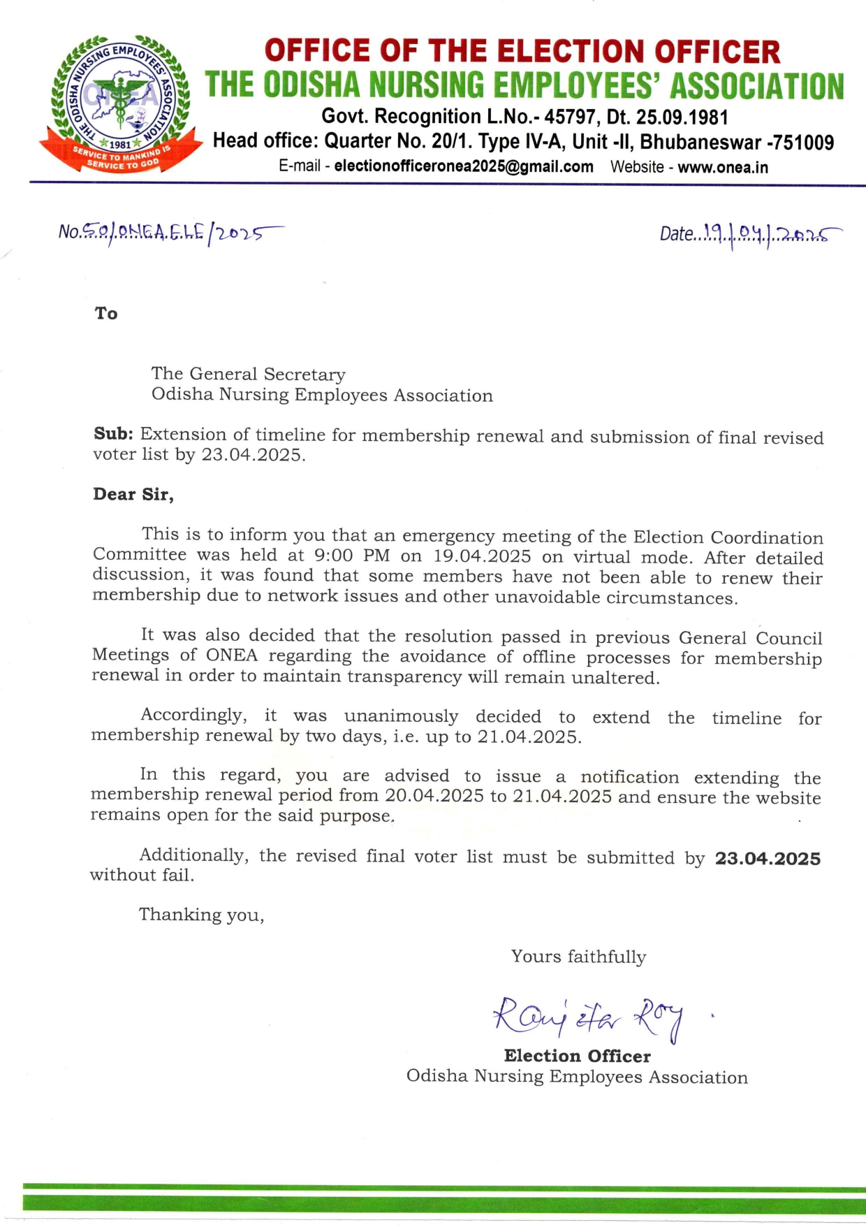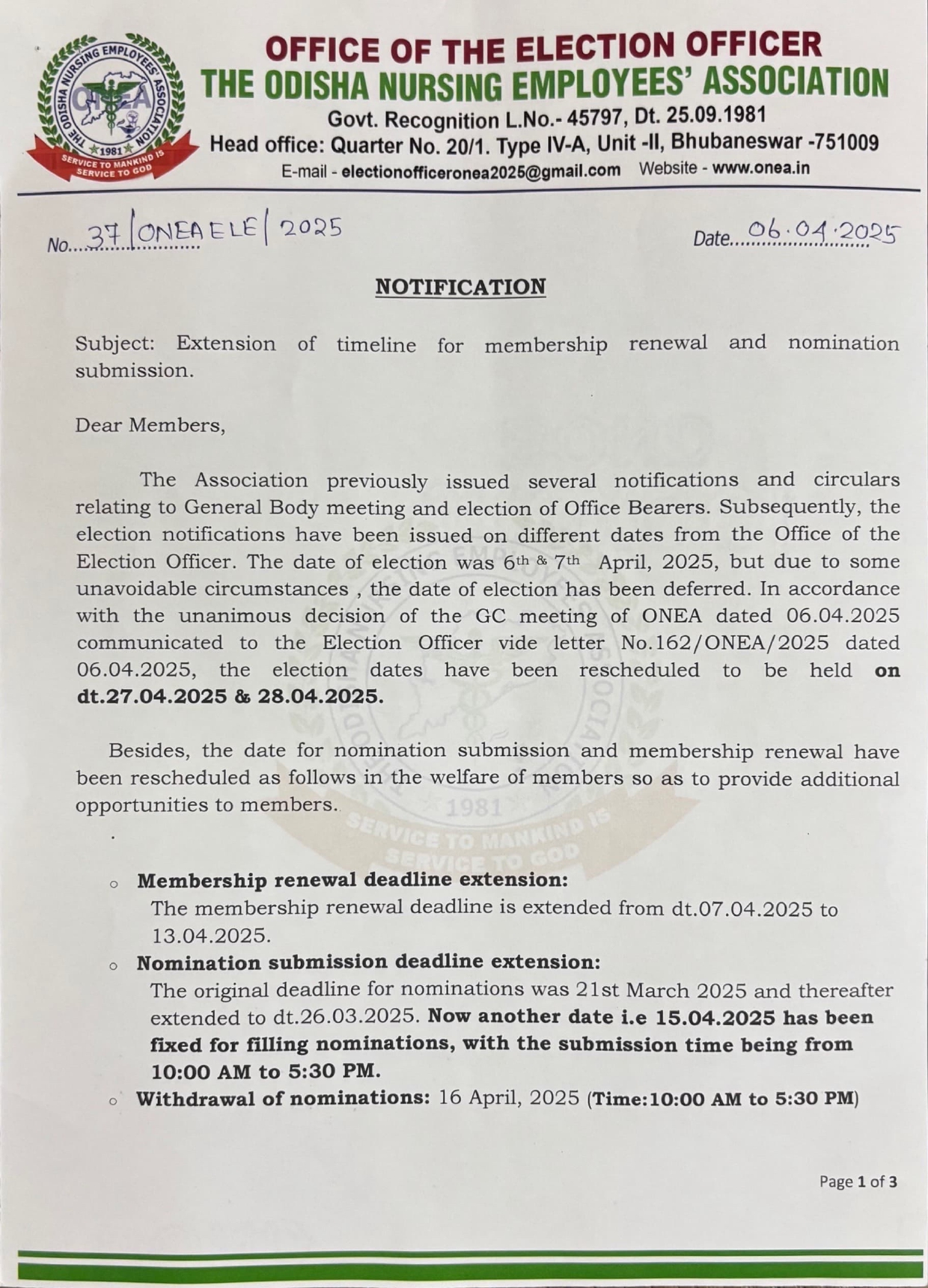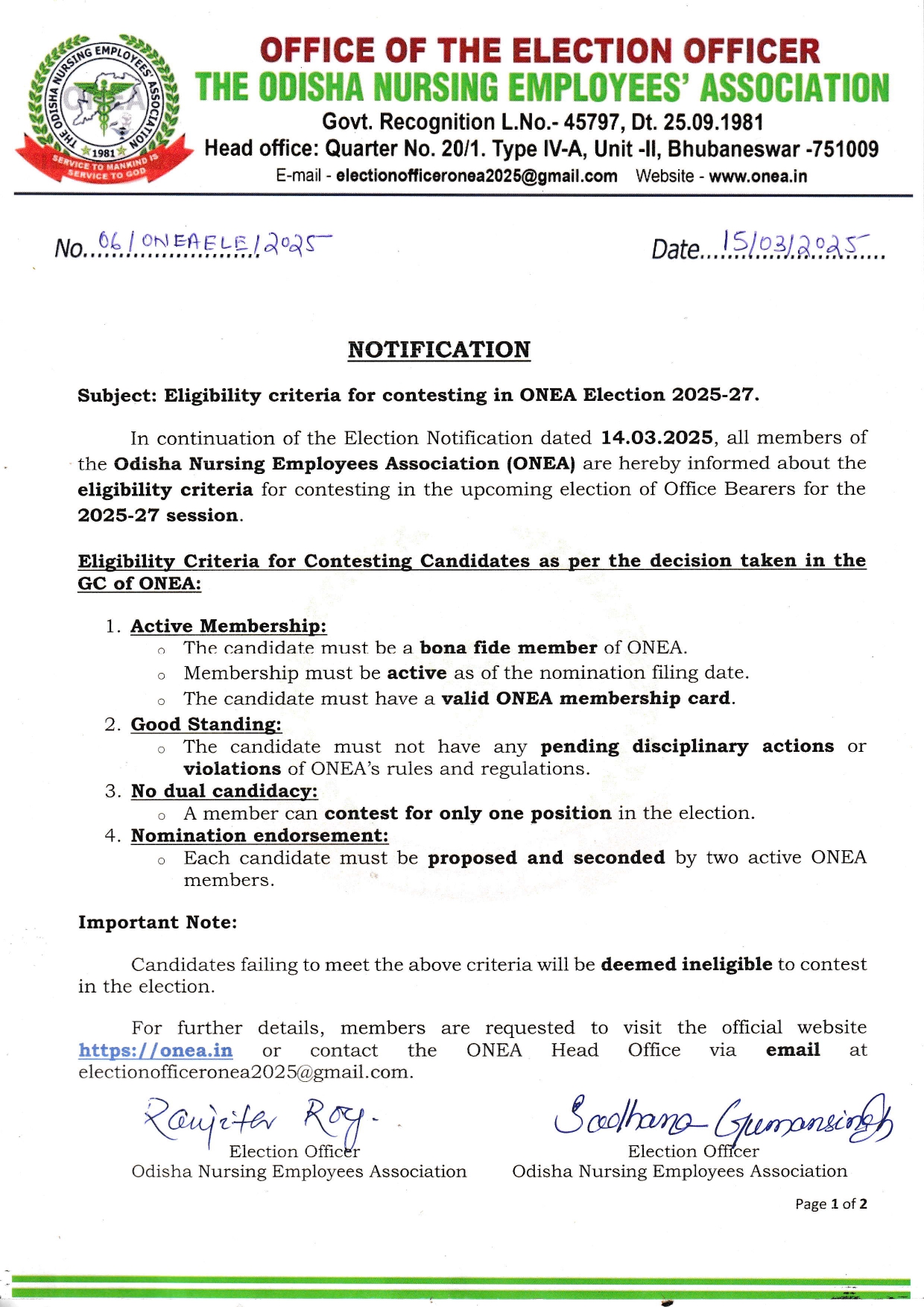 The Odisha Nursing Employees Association (ONEA) is a registered service association of all Nursing Officers, Tutors, Asst. Professors of Nursing Education, Asst. Nursing Superintendents, Deputy Nursing Superintendents, Asso. Prof. of Nursing Education & Nursing Superintendents working in different Govt. Health Care Sectors and nursing educational institutions and it has been recognized by the Government of Odisha vide Home (Assn.) Department Order No.45797, Dated 25th September 1981 <<Read More>>