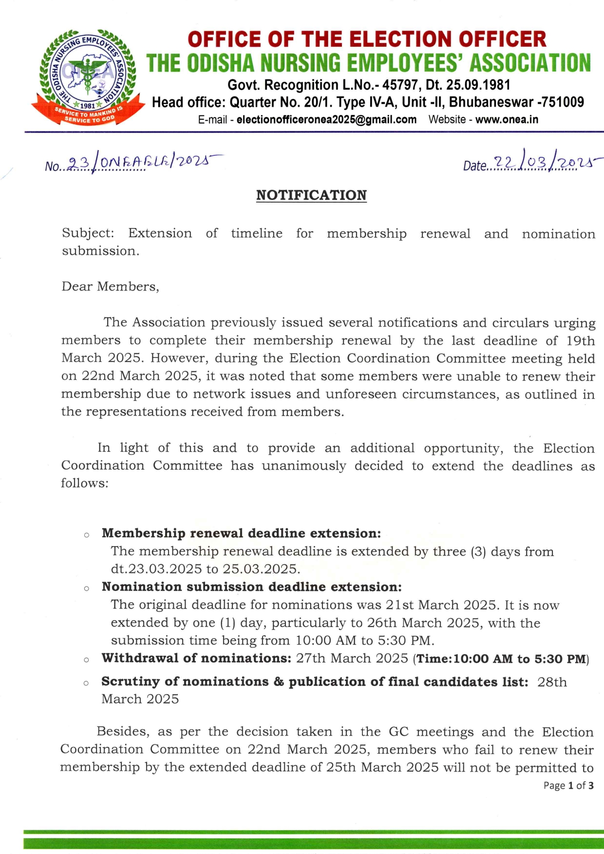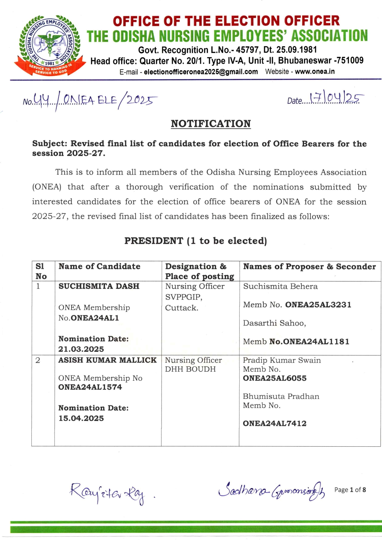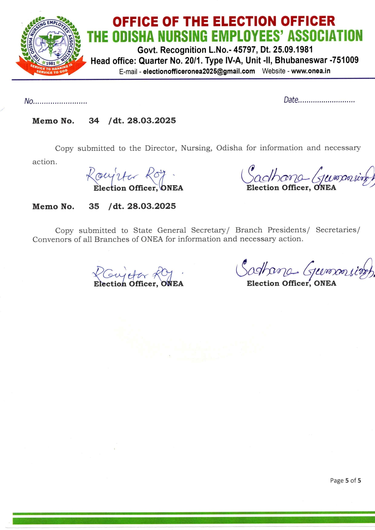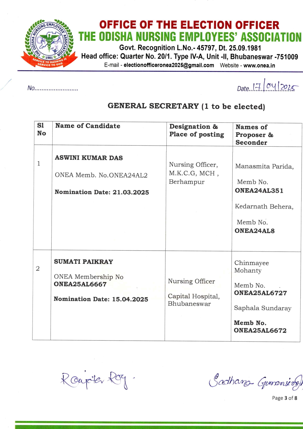 The Odisha Nursing Employees Association (ONEA) is a registered service association of all Nursing Officers, Tutors, Asst. Professors of Nursing Education, Asst. Nursing Superintendents, Deputy Nursing Superintendents, Asso. Prof. of Nursing Education & Nursing Superintendents working in different Govt. Health Care Sectors and nursing educational institutions and it has been recognized by the Government of Odisha vide Home (Assn.) Department Order No.45797, Dated 25th September 1981 <<Read More>>