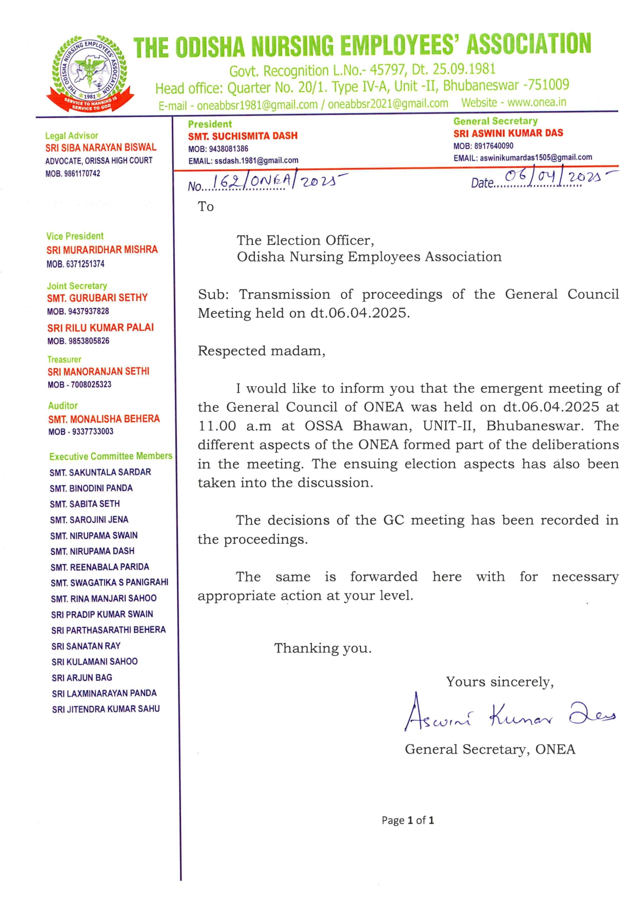 ![]() Shri Aswini Kumar DasState General Secretary, ONEA |